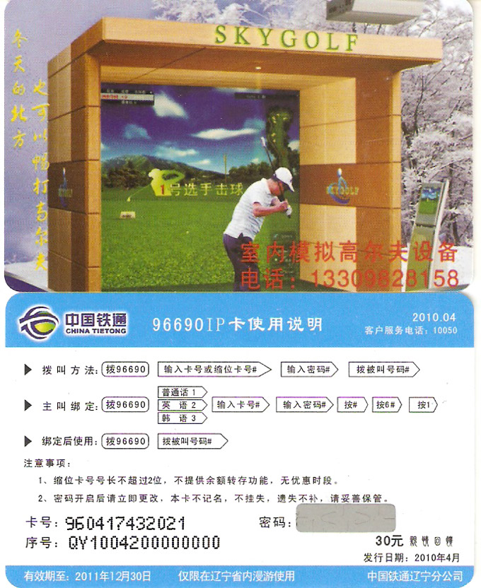这是中国铁通辽宁分公司(已并入中国移动)2010年4月发行的一张以模拟高尔夫为正面图案的96690IP电话卡,面值30元人民币,仅限在辽宁省内漫游使用,有效期至2011年12月30日。 这是世界上发行的第一张以模拟高尔夫为正面图案的IP电话卡,正成为电话卡收藏界的别致风景线! 电话卡正面印有我公司销售热线电话:13309828158。现电话卡已成为我公司赠送贵宾的礼品!